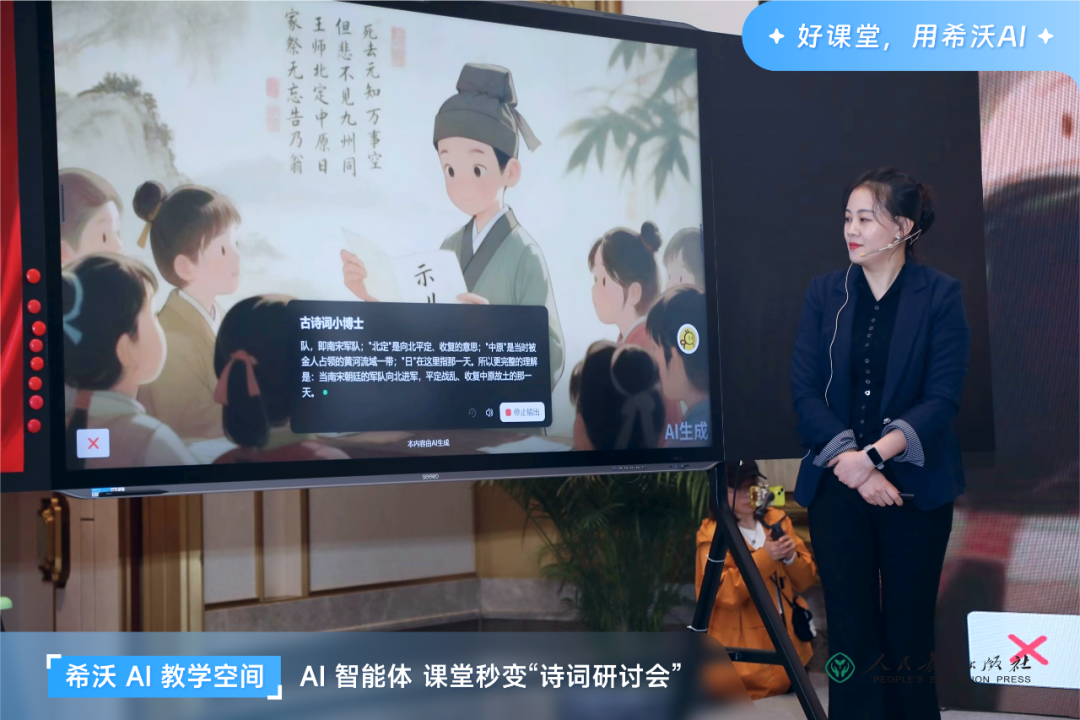 上课中,课堂瞬间化身为一场穿越时空的“诗词研讨会”。得益于希沃教学大模型和多种模型的支持,徐老师轻点屏幕,一位“古诗词小博士”的AI智能体便跃然屏上。