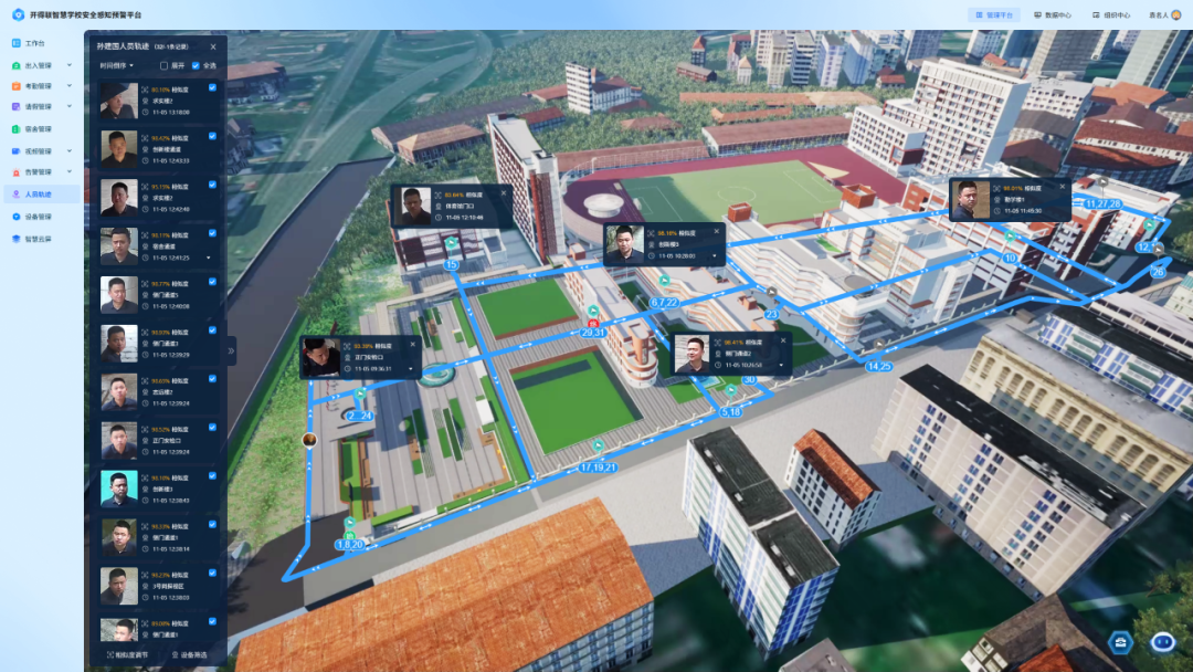 在全域管理层面,3D可视化数字孪生平台将分散的安防设备统一管理,支持管理者在校园安全管理平台上“点哪看哪”,快速调取任意区域的实时画面,让安全管理从碎片化走向一体化,平台支持通过“姓名+人体特征”进行秒级检索,快速定位、还原轨迹,将原来需要数小时的寻找过程,缩短到分秒之间。